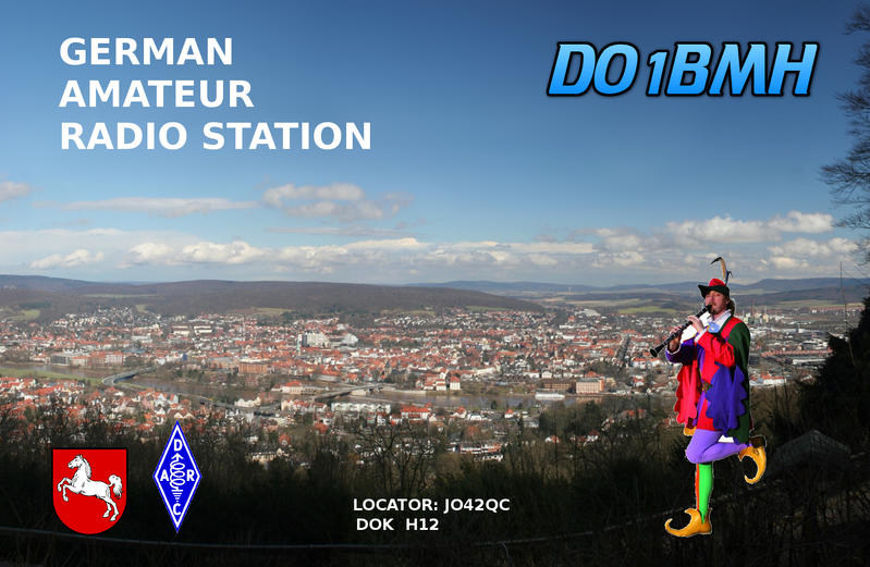 Meine QSL Karte zeigt einen Blick auf die Stadt Hameln vom Klüt aus gesehen. Der Klüt ist ein Berg mit ca 258m Höhe. Und natürlich darf der bekannte Rattenfänger nicht fehlen.